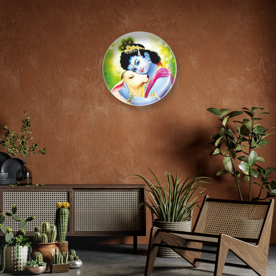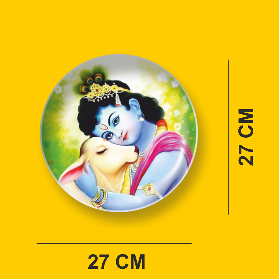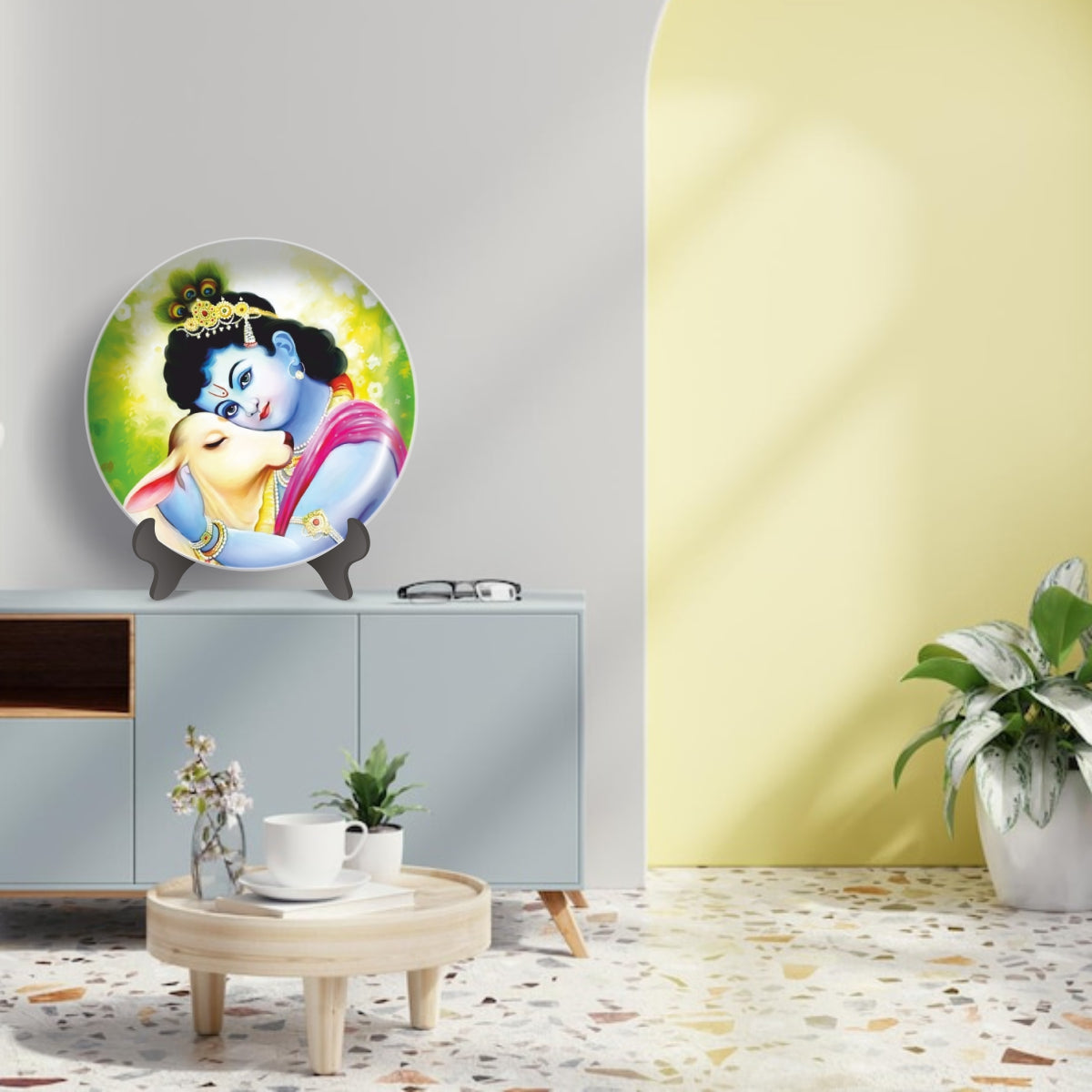 Krishna With Cow, a digital illustration by Vignesh, transferred on a Ceramic Plate is sure to enhance the class of your interiors.